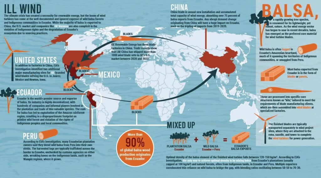 📍 ʺL’industrie éolienne devrait cesser de s’approvisionner en balsa en Amazonie équatorienne tant que les filières ne seront pas traçables et transparentes, afin de garantir sa non-complicité dans la destruction des forêts amazoniennes et l’exploitation des communautés autochtones qui y vivent.ʺ